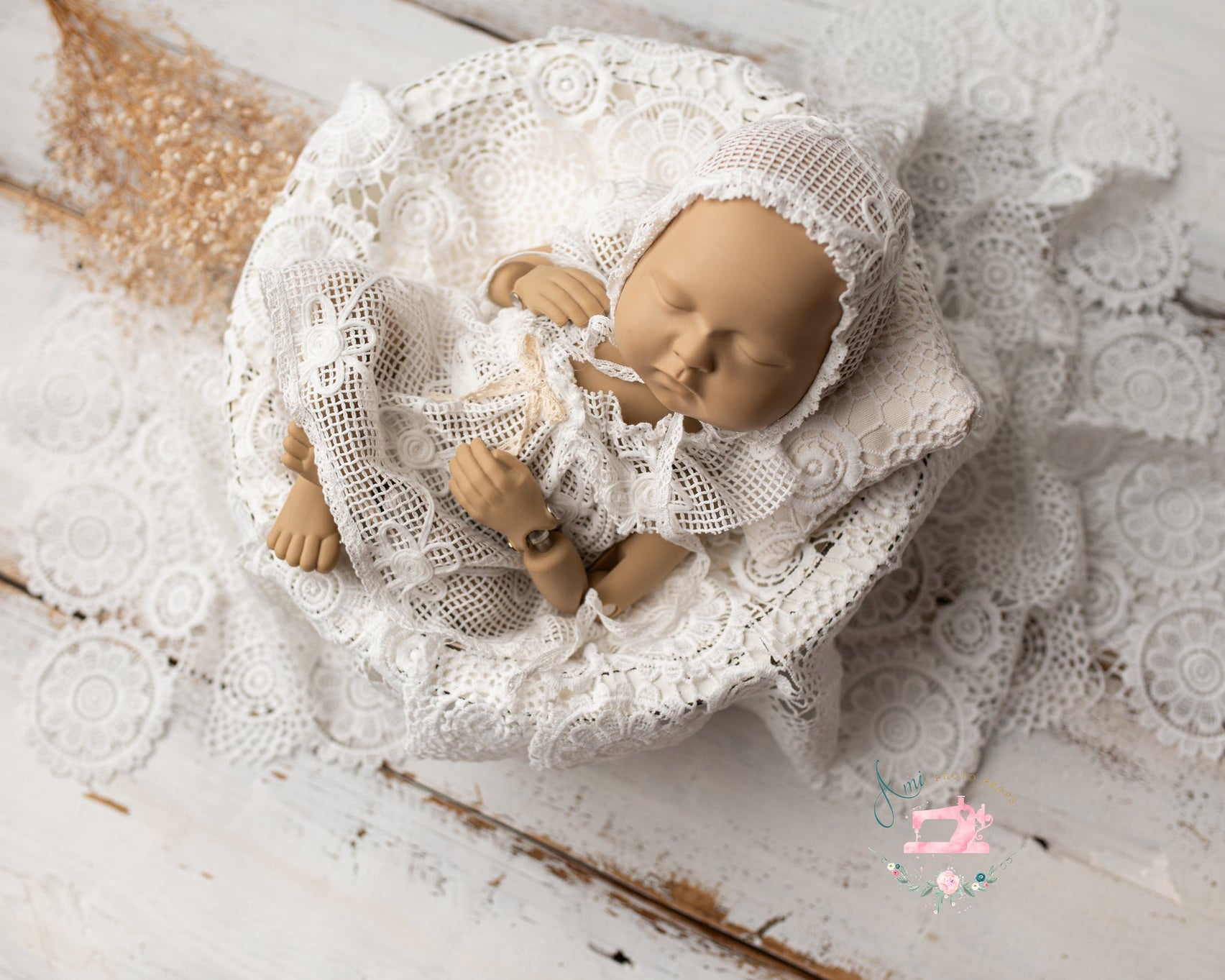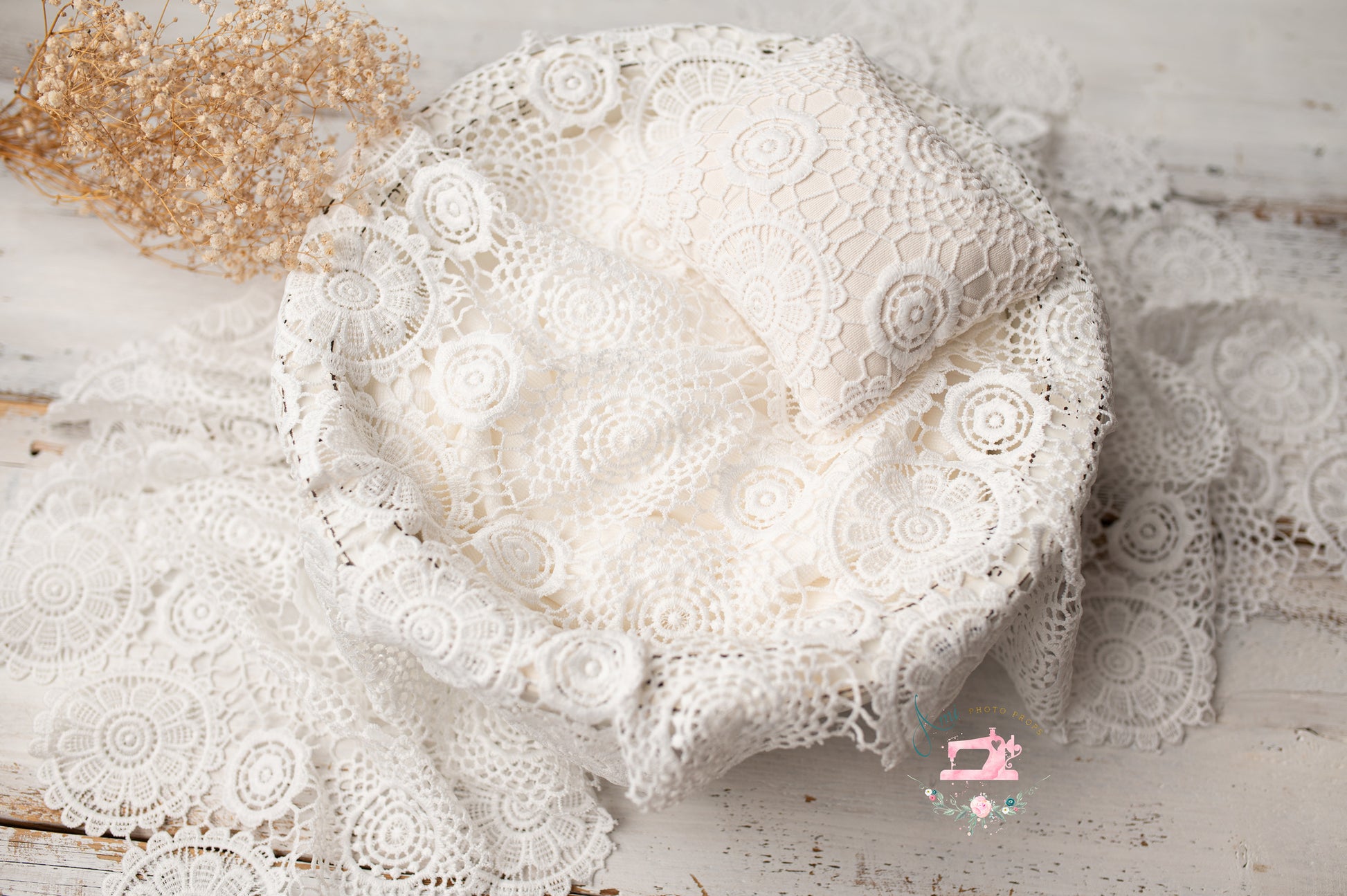 The pillow and throw are made of lace in a retro, boho style. The color is ecru. Suitable for bowls, buckets, bean bags, and posing tables.