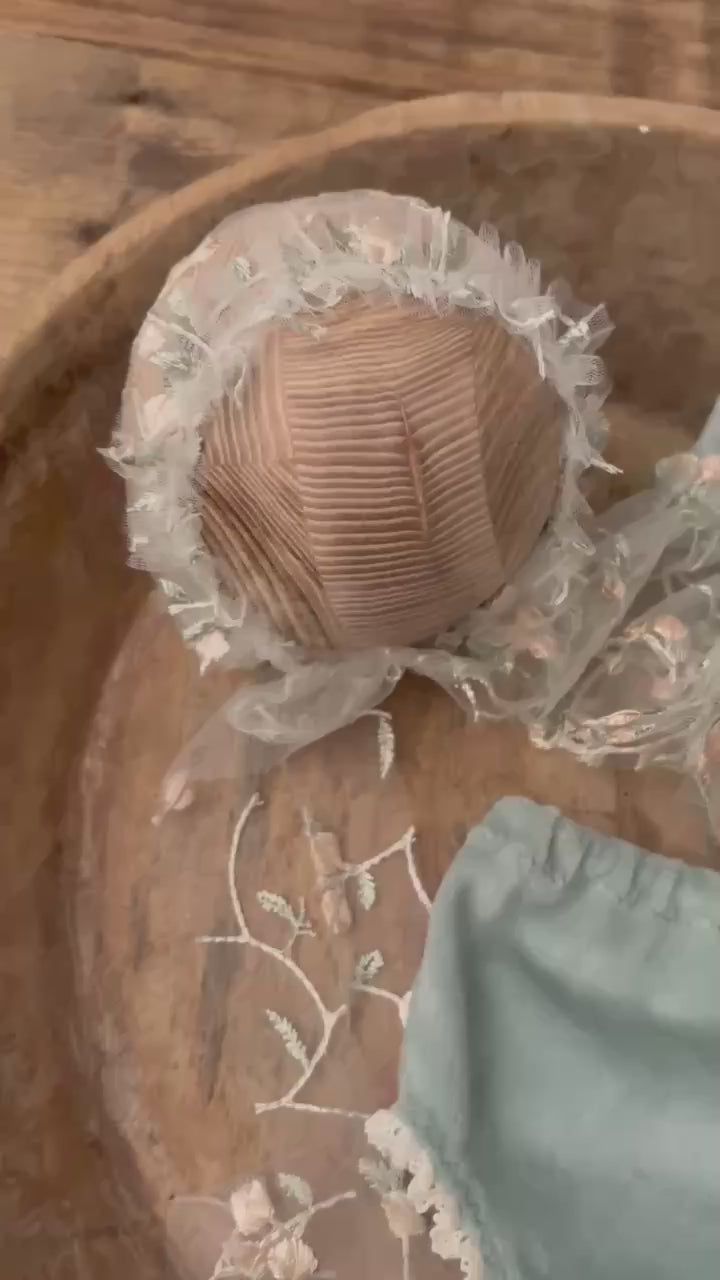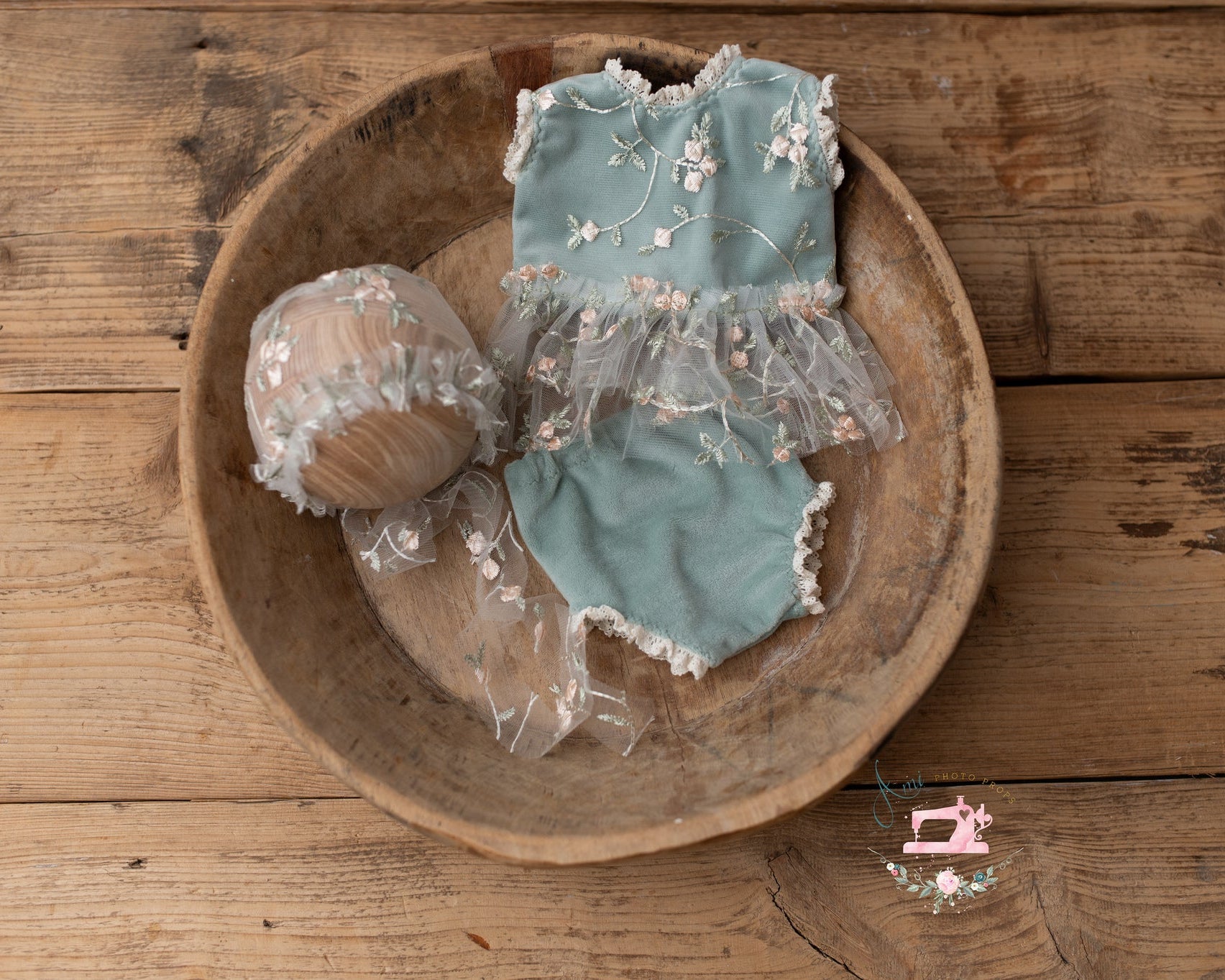 This set is made of stretchy knit fabric—velour and lace with delicate florals. All in shades of sage.